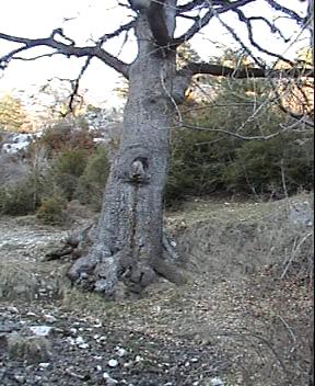 El árbol de la foto es sin duda singular, extraño donde los haya y eso que de raros he visto muchos. No se aprecia muy bien la grandaria de este roble, pués creo que es un roble, que es enorme y no hubo forma de sacarle una foto entero por la dificultad del terreno.