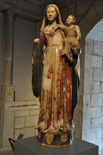 Vemos a la Virgen de Besalú con el niño que lleva a un ibis en una mano que se identifica con Hermes Toth y los escribas. En la base de la talla se ve la cruz de los Castellanos y el escudo borroso que tiene  un águila mirando a su izquierda .