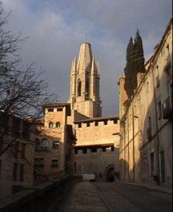 Voy siguiendo la luz, hacia los jardines de la muralla y se ven las dos torres a la derecha de la foto, que guardan una de las puertas que va a la catedral actual (digo actual porque antiguamente también San Félix fue una catedral, aunque en un letrero ponga que ha sido construida en el S.XII, pero ha sido reformada. De hecho consta ya en documentos del S. IX, el mismo Papa Silvestre II dirije una carta al obispo Miró Bofill, con domicilio en San Félix, para que le mande el libro de astrología de Lupitus Barchinonensis, astrólogo de Gerona y el libro de Multiplicaciones y divisiones de Josefo Hispano, otro sabio de Gerona).