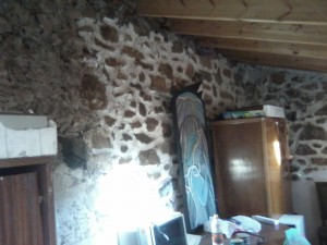 Esto es una hornera donde cocían el pan los antiguos habitantes de mi casa. Lo dejaban todo perdido de humo ya que para que ese saliera levantaban una teja del tejado. Las paredes de la habitación están negras de hollín.