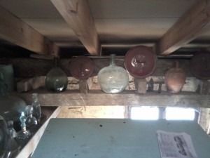 Junto a la hornera estoy improvisando un museo con botellas antiguas, botijos, tapaderas de cacerolas y arcones de piel de la época medieval que estaban por la casa.